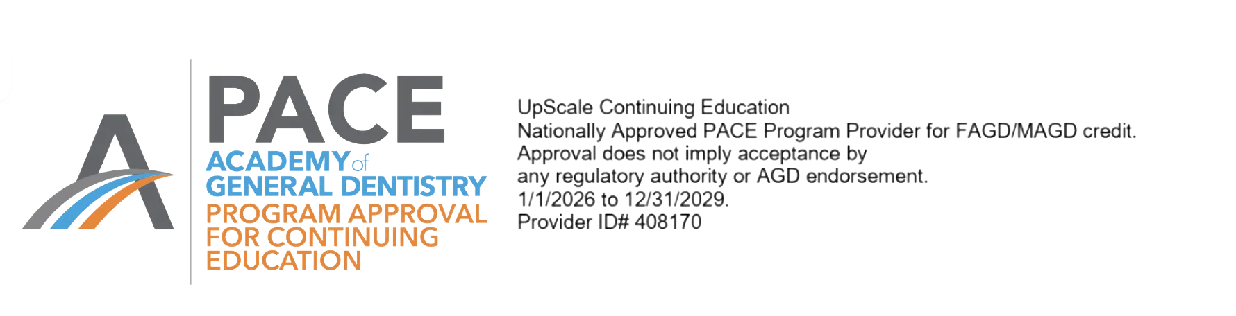 This activity has been planned and implemented in accordance with the standards of the Academy of General Dentistry (AGD) Program Approval for Continuing Education (PACE) through the joint program provider approval of UpScale Education, LLC and National Network of Healthcare Hygienists.
