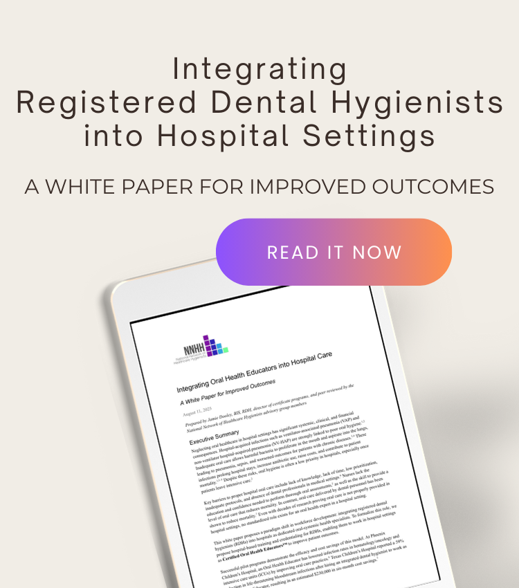 The National Network of Healthcare Hygienists (NNHH) has released a pivotal publication, Integrating Oral Health Educators into Hospital Care: A White Paper for Improved Outcomes, authored by Jamie Dooley, RDH, BIS, CWDP, revealing indisputable evidence that neglect of oral health in hospital settings contributes to preventable infections, longer hospital stays, higher costs, and patient mortality. The paper outlines a clear solution: integrate credentialed dental hygienists into care teams.
